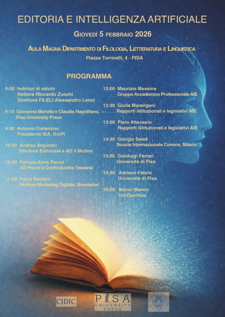 Il convegno intende offrire uno spazio di riflessione interdisciplinare sul complesso rapporto tra il mondo editoriale e i più recenti sviluppi dell’Intelligenza Artificiale Generativa. Attraverso il contributo di editori, professionisti ed esperti del settore, saranno analizzate le trasformazioni in atto nei processi di produzione, diffusione e tutela dei contenuti. L’incontro si propone di discutere le opportunità e le criticità dell’uso dell’IAG nell’editoria contemporanea, discutendone anche le potenziali implicazioni economiche, etiche, giuridiche e culturali.