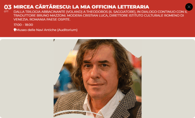 La letteratura romena sarà al centro di incontri, dialoghi, presentazioni e performance teatrali. Cărtărescu, una tra le voci più autorevoli del panorama letterario contemporaneo, aprirà il festival giovedì 2 ottobre, alle ore 18:30, e tornerà a incontrare il pubblico venerdì 3 ottobre, alle ore 17:00, nell’evento dal titolo Mircea Cărtărescu: la mia officina letteraria. Dalla trilogia Abbacinante (Voland) a Theodoros (Il Saggiatore), in dialogo con il suo traduttore, il professor Bruno Mazzoni.