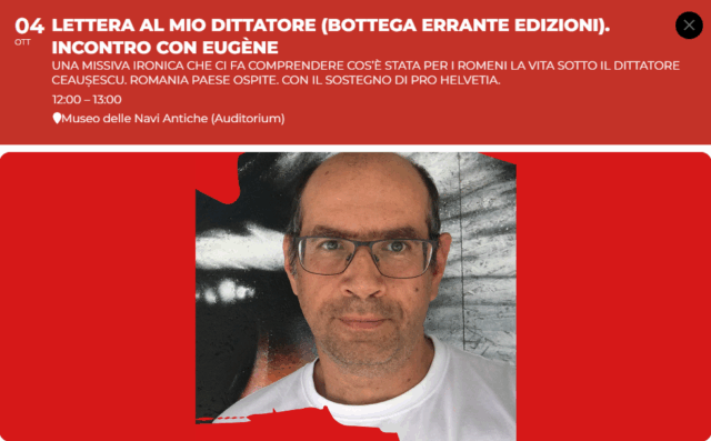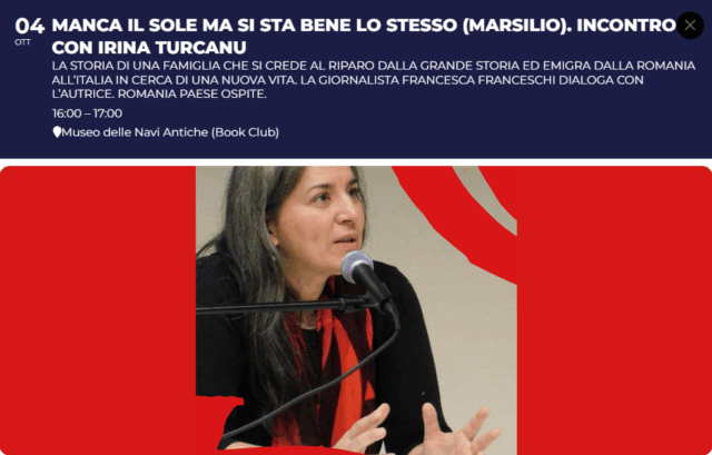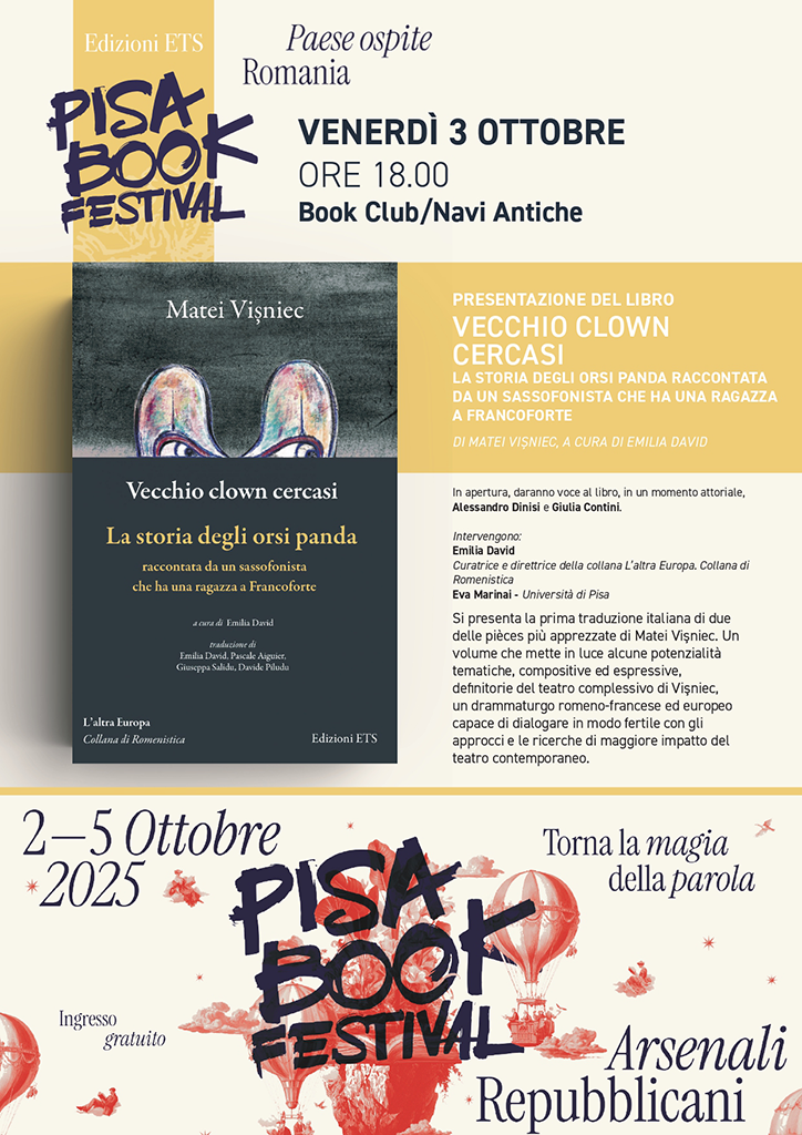Si segnala inoltre la presentazione del volume di Matei Vișniec, uno dei più interessanti drammaturghi attuali, Vecchio clown cercasi. La storia degli orsi panda raccontata da un sassofonista che ha una ragazza a Francoforte (ETS, Pisa, 2024), in programma venerdì 3 ottobre alle ore 18:00, presso il Book Club del Museo delle Navi Antiche. Daranno voce al testo teatrale, in una breve performance attoriale, Alessandro Dinisi e Giulia Contini.